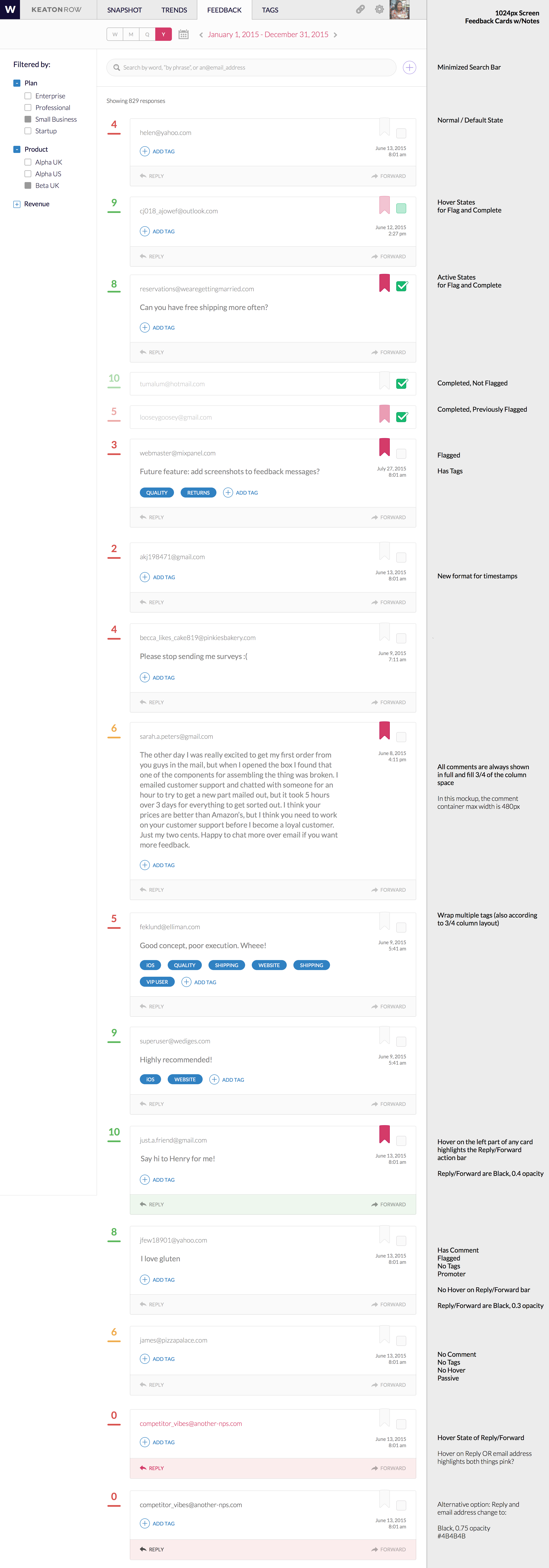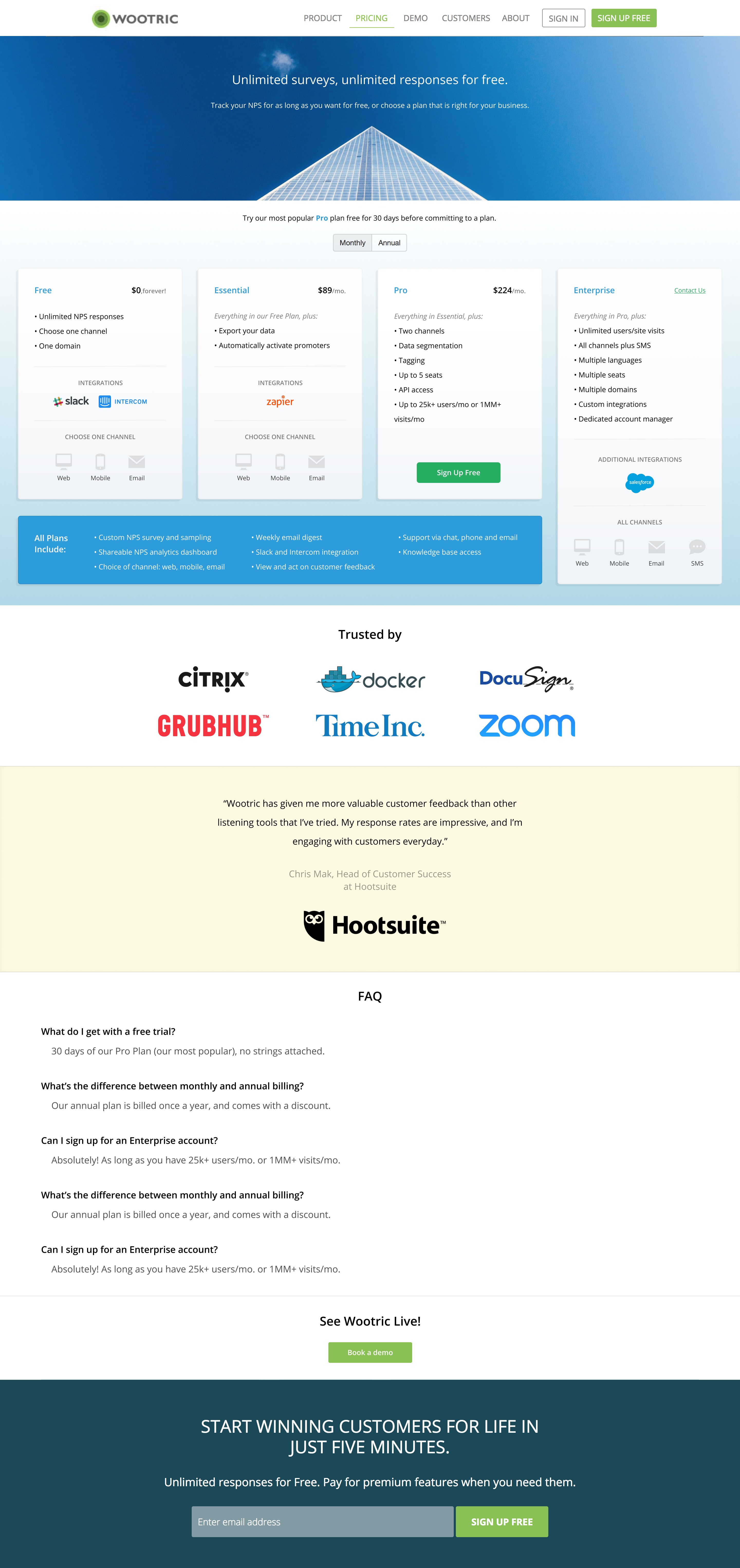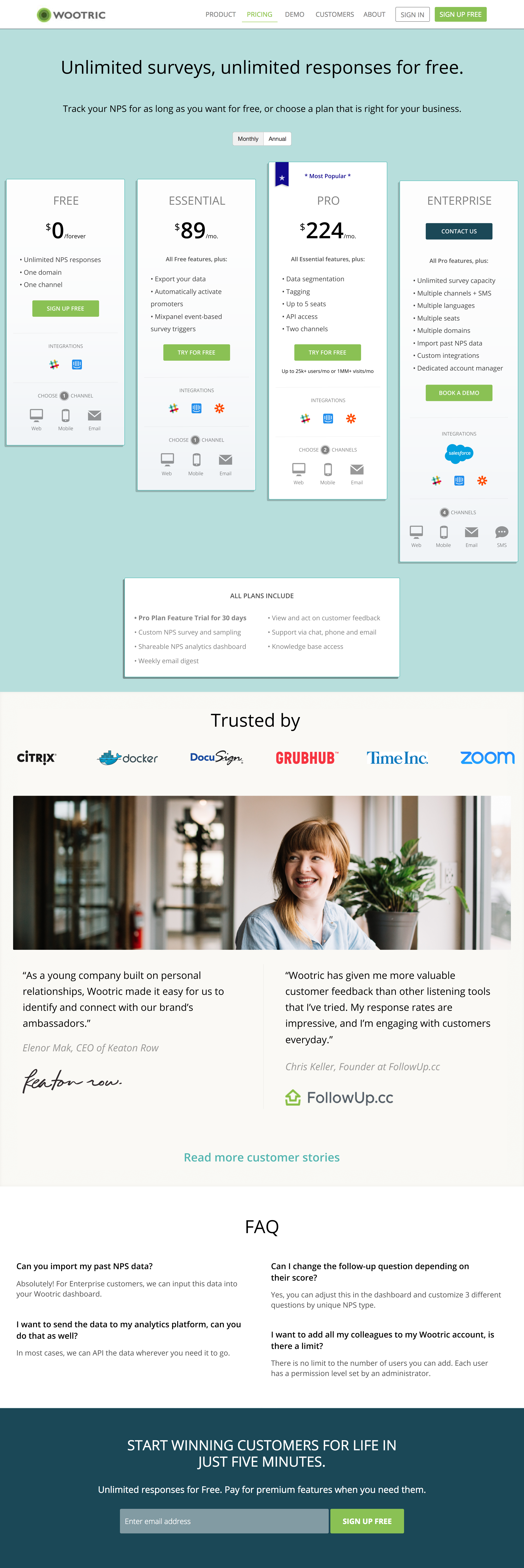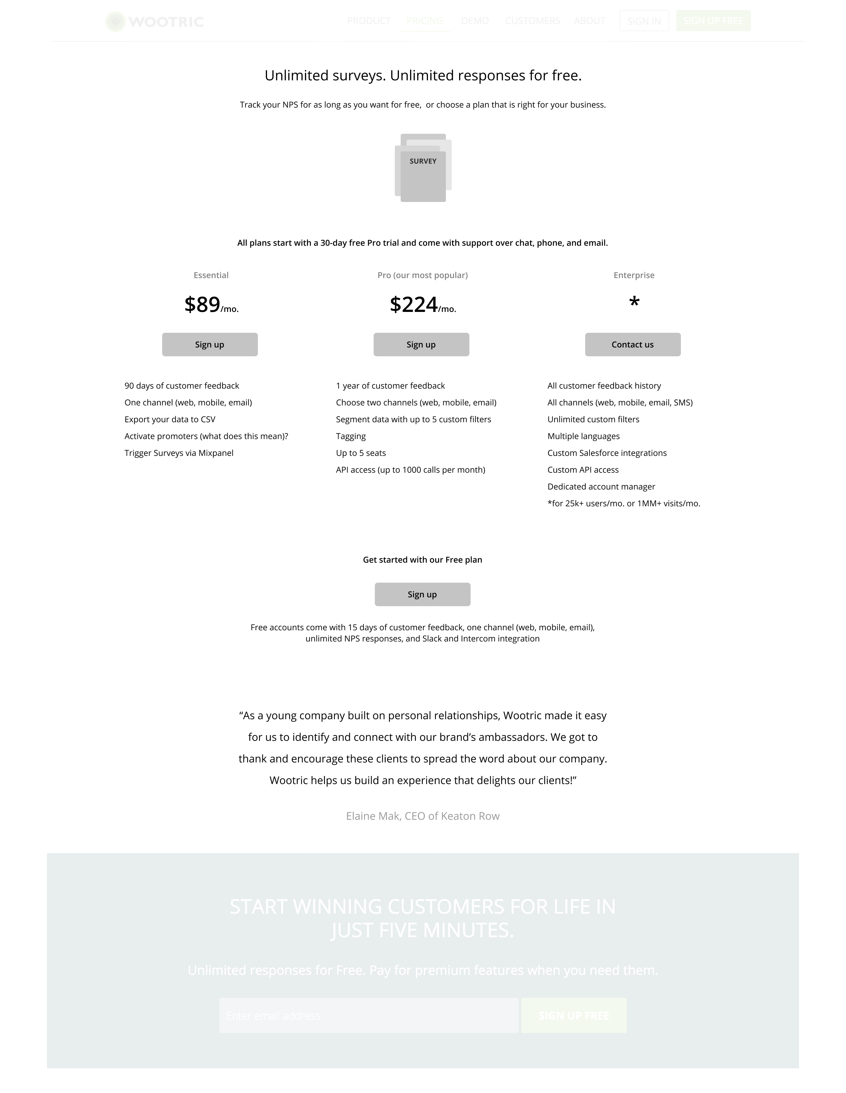 In Dec 2016 / Jan 2017 I contracted with Wootric for a small project to redesign their pricing page. Here are some of my iterations, including a link to the pricing page in production at the end! As of this date (Feb 2019) it's still the way I'd designed and built it.